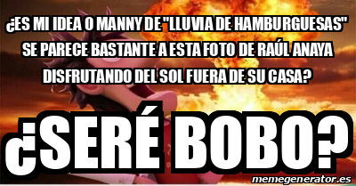Post a Comment for "Memes Lluvia De Hamburguesas : Meme Personalizado Es Mi Idea O Manny De Lluvia De Hamburguesas Se Parece Bastante A Esta Foto De Raul Anaya Disfrutando Del Sol Fuera De Su Casa Sere Bobo 31916136"
